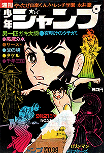 基本的には漫画のキャラが表紙になる少年ジャンプだが、まだこの頃は、マガジンなどの影響もあってアート的な雰囲気もあるものになっている。最初期のジャンプを支えていた『男一匹ガキ大将』と『ハレンチ学園』が表紙を多く飾っている。36号では早くも100万部を突破。80円から90円に値上げしている。